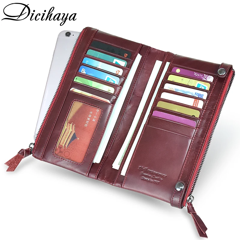 (50% Off) Comprar Dicihaya Marca De Luxo Genuíno Couro Carteira Feminina Duplo Zíperes Carteiras Longo Embreagem Moeda Bolsa Bolso Vermelho Saco Do Telefone Baratas Online Preço