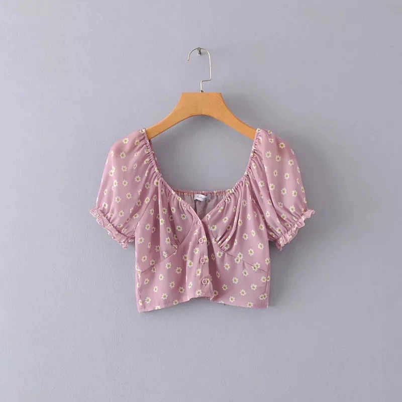 (40% Off) Comprar Blusa Feminina Sweetheart Decote Botão Up Colheita Com Mangas Puff Little Daisy Crop Baratas Online Preço